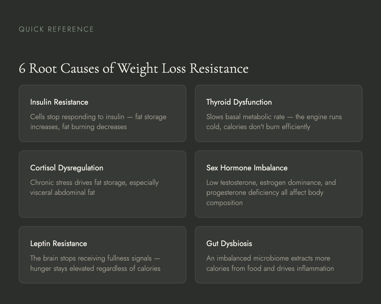 The honest answer is: with a proper workup. Not another elimination diet. Not a new supplement protocol. An actual investigation into which of these mechanisms is driving your particular pattern of weight resistance.